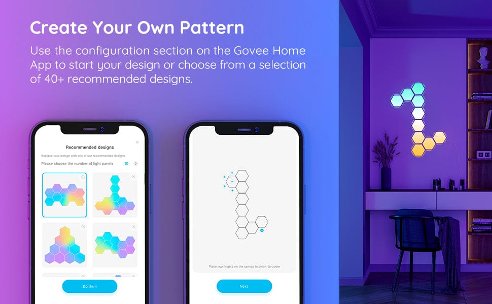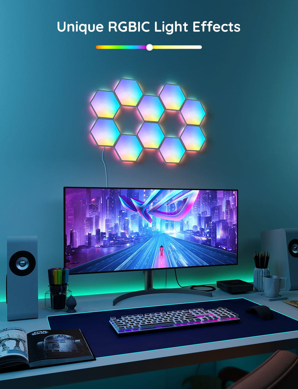 Govee Glide Hexa Light Panels are composed of 10 panels that can be assorted into various shapes. It can be controlled using your favorite voice assistants such as Alexa and Google Assistant as well as the Govee Home App. You can even customize your design, effects, colors, and more.