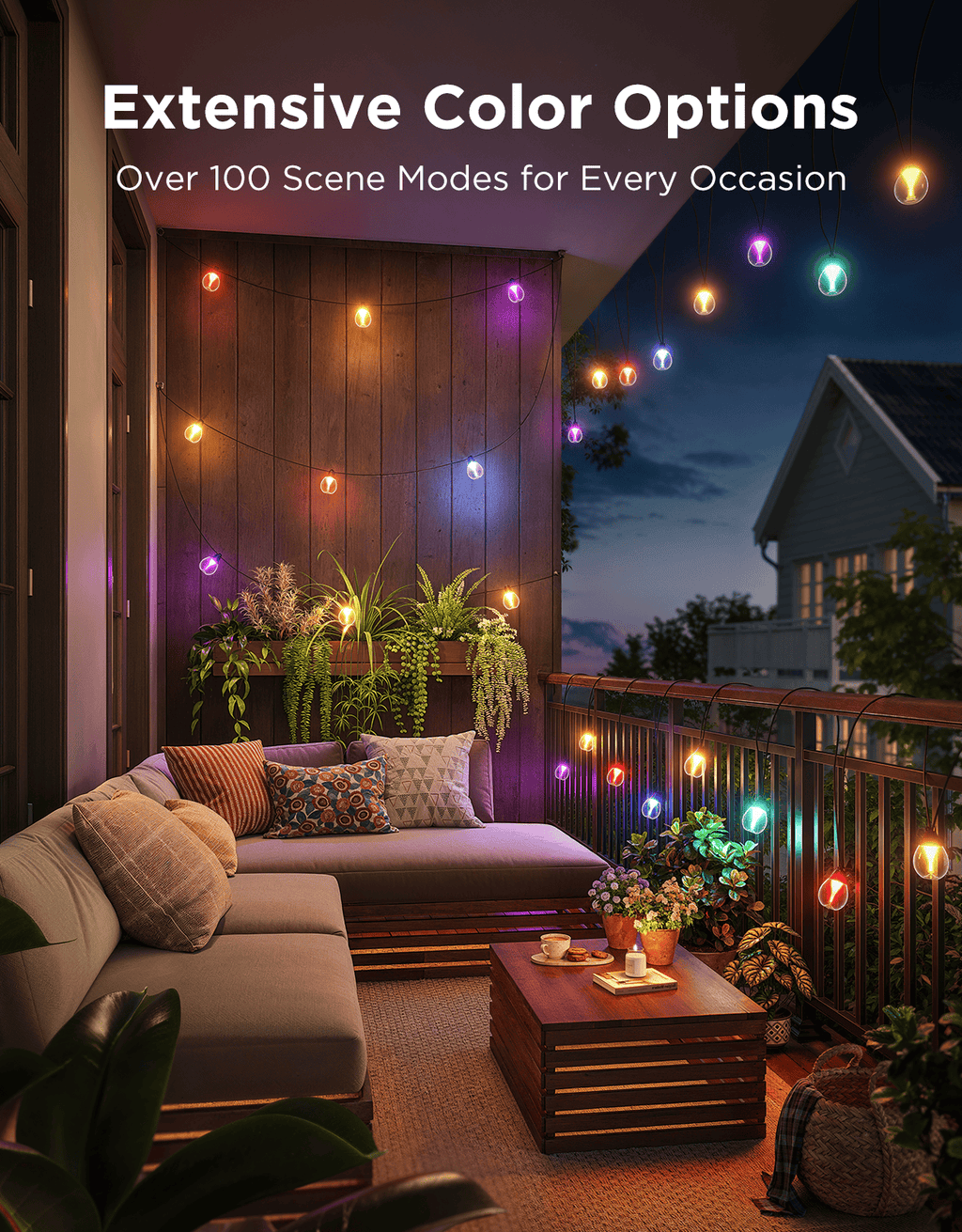 - Multi Colored Outdoor String Lights: These RGBWIC String Lights offer 16 million color options and 111 preset scene modes. Decorate your patio with colorful accents or set vibrant lighting for relaxing evenings and lively parties.