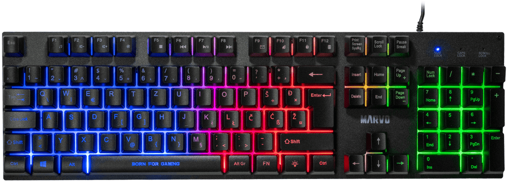 Keyboard: A 104-key membrane keyboard with double-shot keycaps and 3-color backlighting (rainbow effect). Designed for long durability with up to 10 million keystrokes and supports 19-key rollover. SLO/CRO layout.