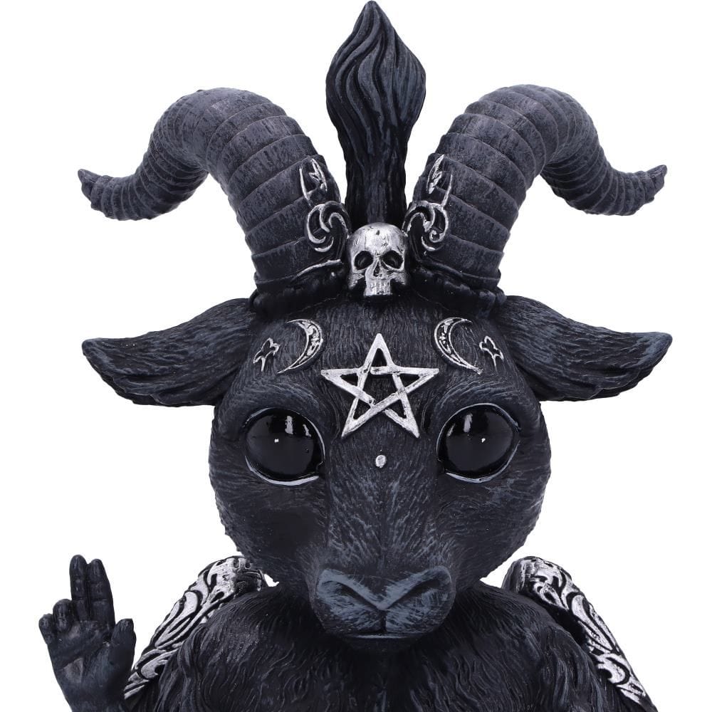 From the bewitching mind of our in house design team comes this adorable, wide-eyed Baphomet. Sitting cross-legged, this Baby Baphomet sits, symbolizing the sum total of the universe. Legs ending in cloven hooves, the staff of Asclepius rises from their crotch. Their right arm is raised in a magical blessing with the word SOLVE (Separate) written on their forearm, while its left arm is stretched downwards and outwards invitingly, forearm bearing the word COACULA (Join Together). Their triple-horned goat's head stares directly forwards as their wings stretch out behind them. Cast in high-quality resin and carefully hand-painted this figurine is likely to be the cutest occultist you've ever seen. Alongside the rest of our Cult Cuties, this amalgamation of horror and delight will make the perfect addition to any macabre fanatic's collection.