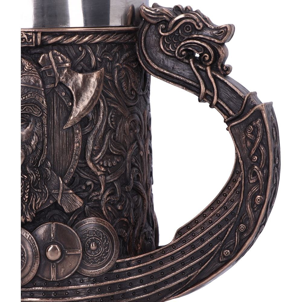 Fight for Valhalla with the Bronze Drakkar Tankard, exclusive to Nemesis Now's Premium high-quality giftware collection! The body of this Tankard is adorned with intricate carvings from the great Viking Longships of old. A warriors face is emblazoned on the side of the mug, wearing a large helm with two menacing axes crossed behind him. Below the portrait is an image of Viking shields leaning on the hull of a longship. The handle is fashioned from the bow of a large Viking Battle Ship, complete with a carved Dragon's head that forms the top of the handle. Cast in top-quality bronze, this Tankard comes with a removable stainless steel insert for ease of cleaning.