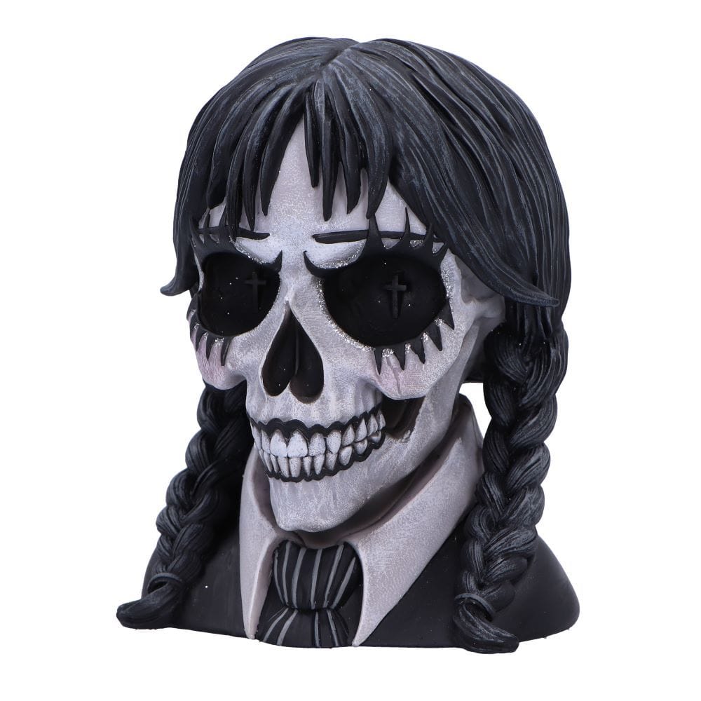 Dark Glare is a unique decorative piece that combines gothic aesthetics with glamour. This striking skull ornament features monochromatic accents, wispy bangs, and neat pigtails draping over the shoulders, adding a touch of mystery to any space. The product is hand-painted with exceptional attention to detail and cast in high-quality resin, ensuring durability and quality. The skull is adorned with subtle glitter accents around the eyes, enhancing its captivating appearance. The black and white school uniform paired with plaited black hair adds a playful touch, making this ornament an eye-catching addition to any collection. It comes packaged in an attractive gift box that reflects the essence of the Dark Glare design, ready to impress upon unboxing. This product is ideal for enthusiasts of gothic, alternative, and dark décor who appreciate unique and bold design pieces.