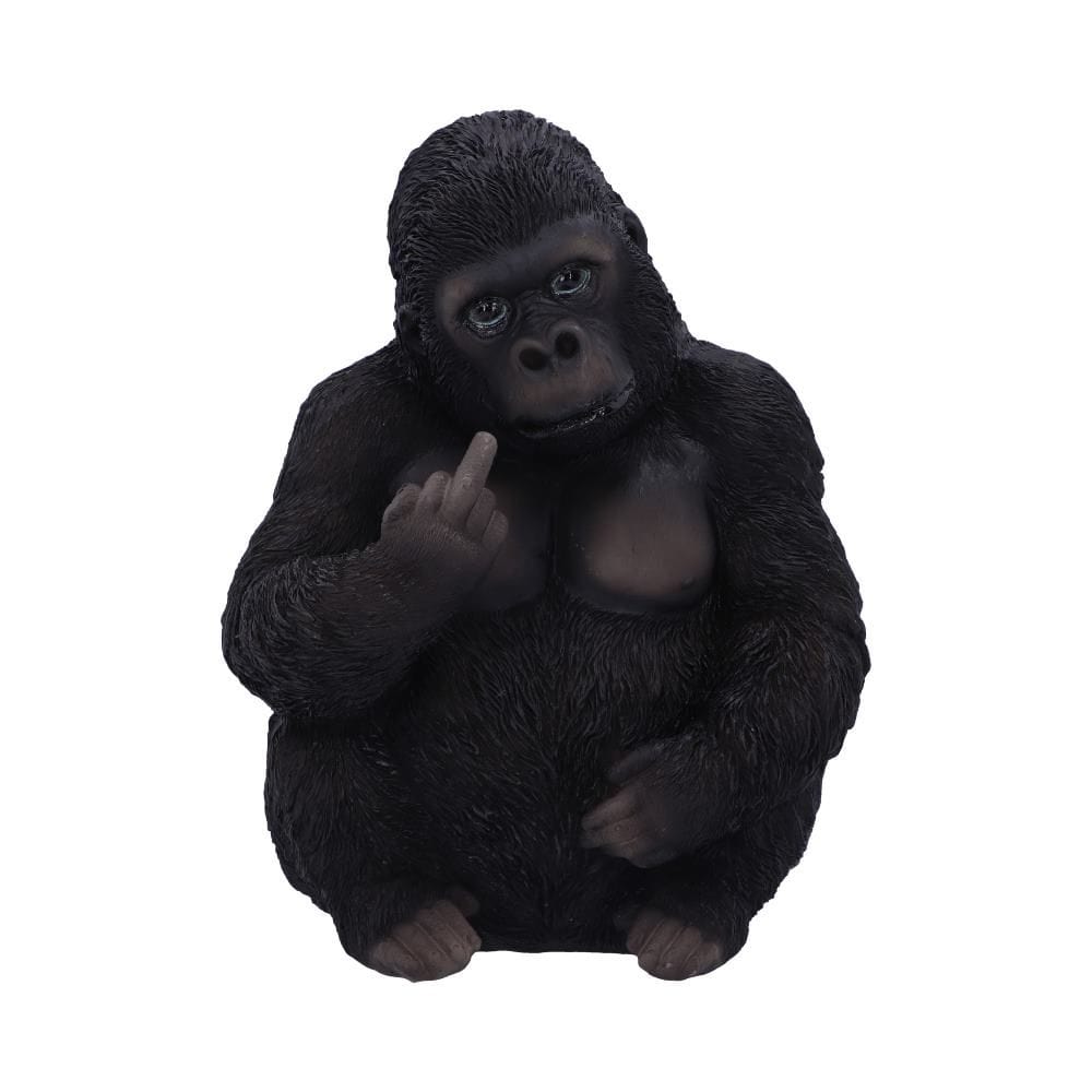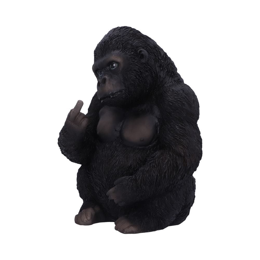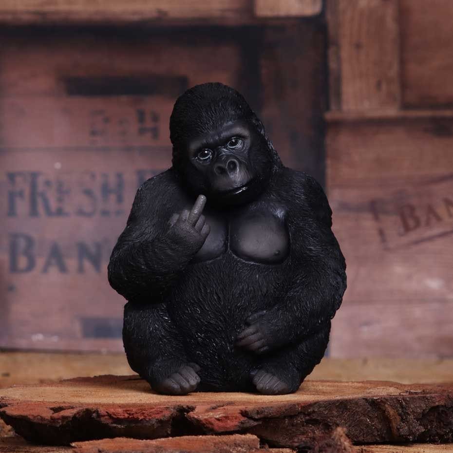 Gone Wild is a unique gorilla figurine sitting on its haunches, boldly raising its middle finger, reflecting its cheeky character.