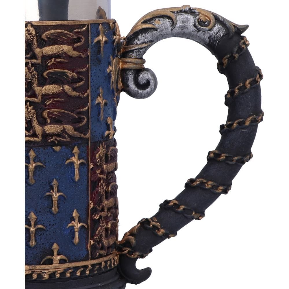Available as part of our Premium high-quality wholesale selection, this Tankard is exclusively available from Nemesis Now. The main body of the Tankard has a repeating pattern of the royal standard of Edward III, with 3 gold lions on a red field quartered with a pattern of gold Fleur-de-Lys arranged on a blue field. A thin gold chain circles the body just above the black base. The handle curls out from the side, black with a slender gold chain wrapped around it, with the top being enveloped in a silver sheath wild curled golden patterns wrapped around it. Cast in the finest resin before being carefully hand-painted, this Tankard comes with a removable stainless-steel insert for ease of cleaning.