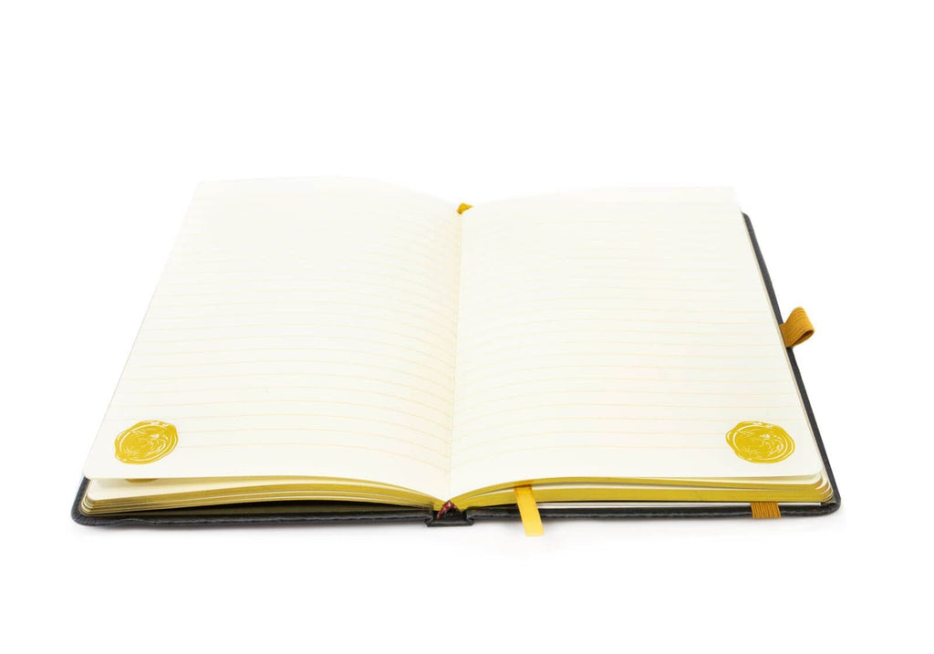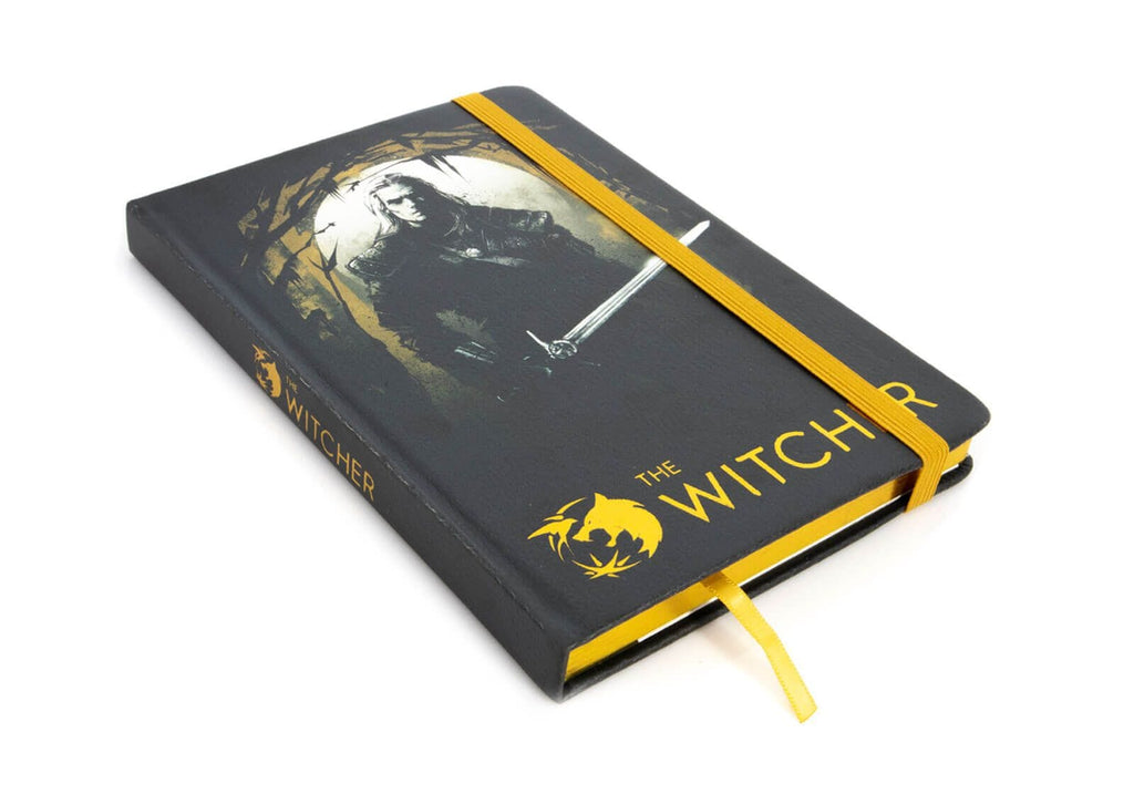 PYRAMID THE WITCHER (FOREST HUNT) PREMIUM A5 BAG with elastic and striped pages. Outside pages coloured gold. Has a pen loop. The size of the notebook is 14 x 21 cm.