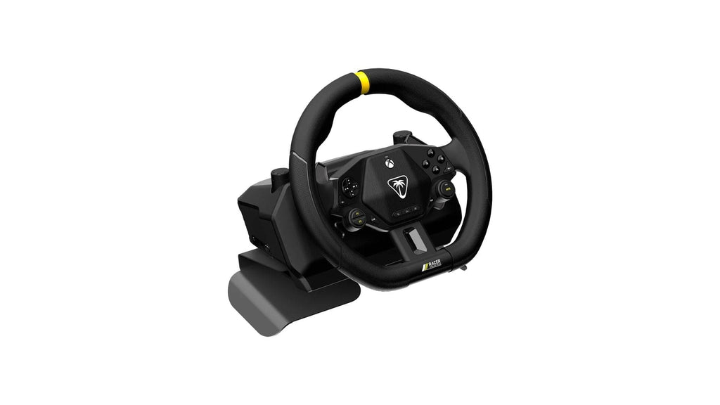 Enjoy wireless racing freedom, officially licensed for Xbox consoles & Windows PCs with the Turtle Beach Racer wireless racing wheel. Racer is a complete, all-in-one system, and connects via 2.4GHz low latency wireless connection with up to 30ft of wireless range and up to 30 hours of battery life. Race from your couch or lock in at a desk or table with either the included non-slip, adjustable lap mount, or integrated table clamps. Designed for your favorite racing titles as a wireless wheel, Racer also features controller mode for use as a wheel in driving games that do not support wheels like Rocket Racing.